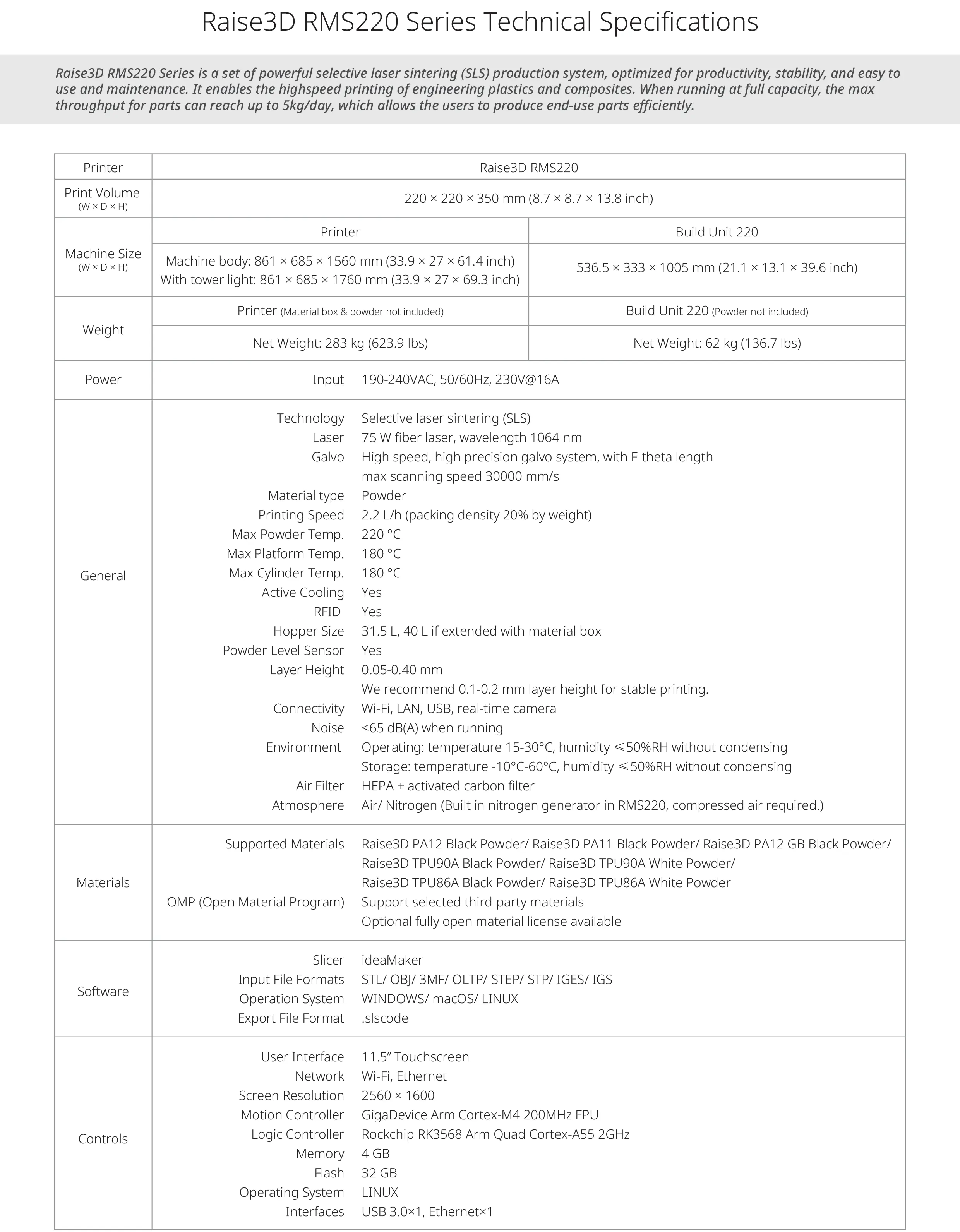 พื้นที่สร้างงานขนาด 220 x 220 x 350 mm (LxWxH) รองรับวัสดุได้ 17KG ทำให้ RMS220 ถือเป็นเครื่อง SLS 3D Printer ระดับเริ่มต้นเกรดอุตสหกรรม ที่ให้พื้นที่ขึ้นงานใหญ่เป็นอันดับต้นๆ and a build volume of 17L, the RMS220 offers one of the largest build sizes among entry-level industrial SLS printers. It meets diverse user needs, from small batch production to the design and development of medium and large parts.