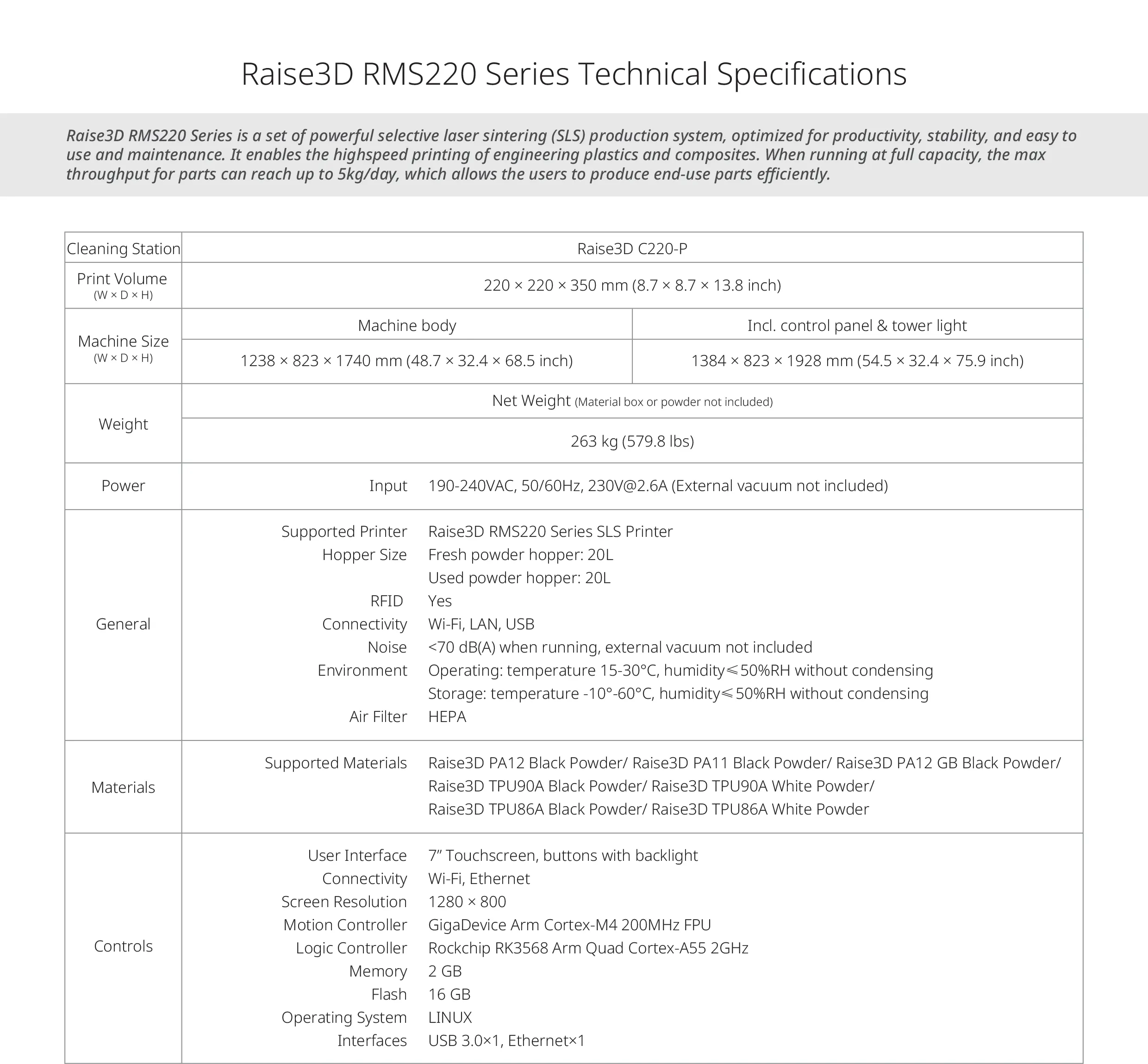Space-Efficient Design: Despite its large build size, the RMS220 maintains a compact footprint of just 0.58 square meters, saving valuable floor space.